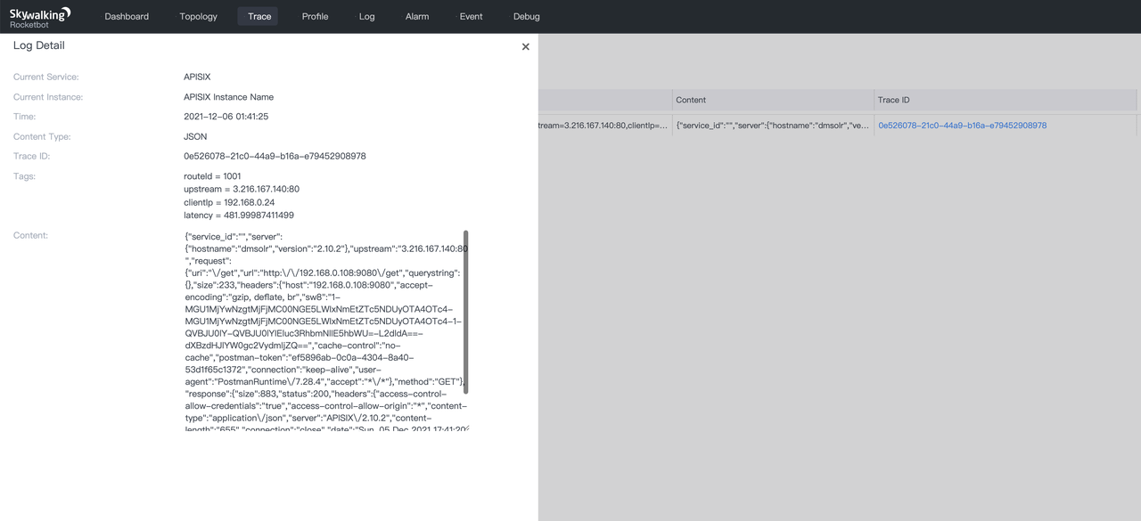 Then you can use the SkyWalking Tracing plug-in to get the tracing data directly, so you can verify that the Logging plug-in-related features are enabled and working properly.